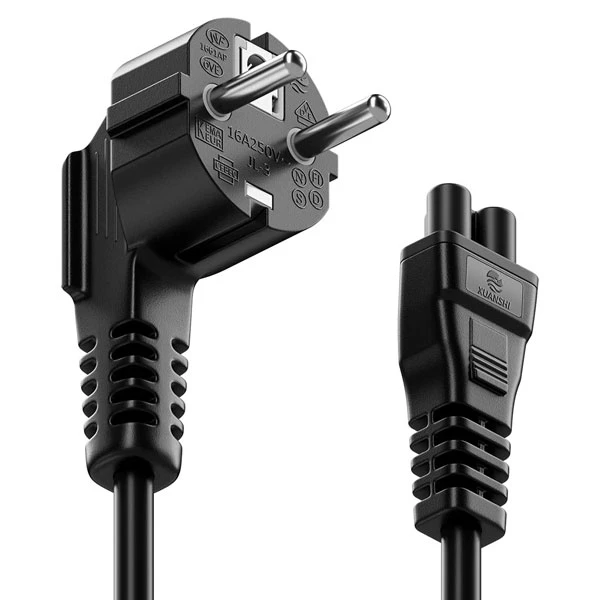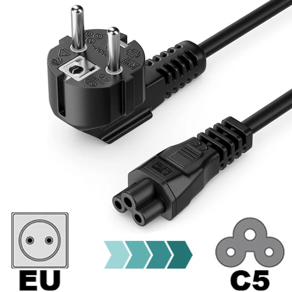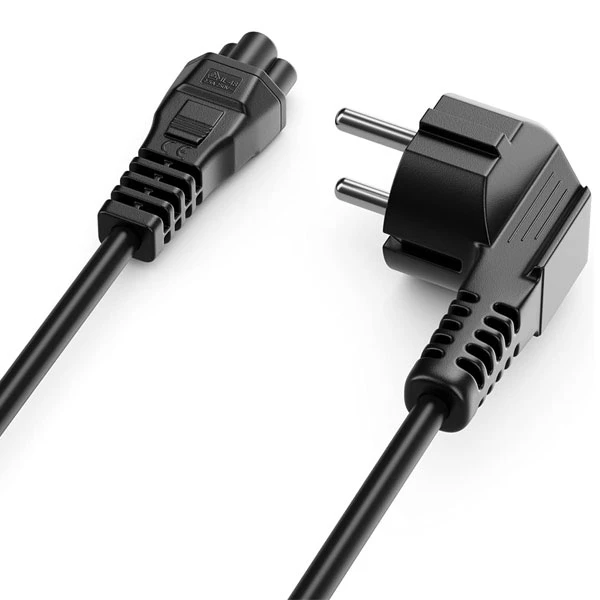 در یک سمت کابل، سوکت سه پین IEC C5 (EU-C5) برای اتصال به آداپتور لپتاپ یا پاور دستگاه قرار دارد. در سمت دیگر، دو شاخه برق استاندارد ایرانی (EU Plug) برای اتصال به پریز برق شهری تعبیه شده است.