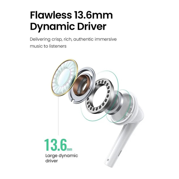 درایورهای ۱۳.۶ میلیمتری این هندزفری صدایی واضح و غنی با بیس عمیق و تفکیک بالا تولید میکنند. دامنه فرکانسی گسترده 20Hz تا 20kHz امکان شنیدن دقیقترین جزئیات در انواع سبکهای موسیقی را فراهم میسازد؛ از موسیقی کلاسیک گرفته تا پاپ و جَز.